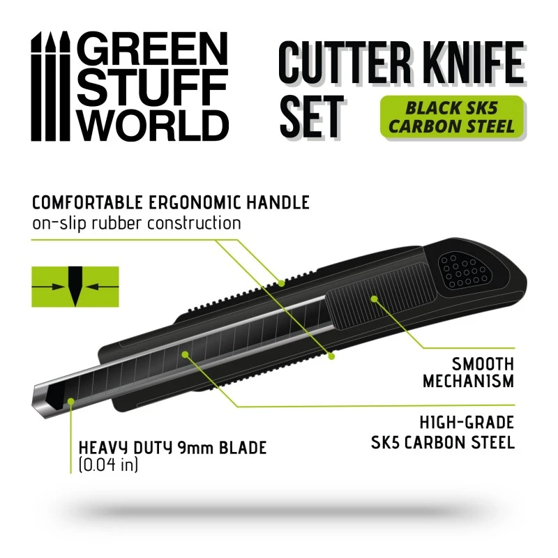 GSW ComfortGrip Cutter Knife with a non-slip rubber compact handle construction, smooth mechanism, and BLACK high-grade SK5 carbon steel blades for deep and precise cutting and maximum control.