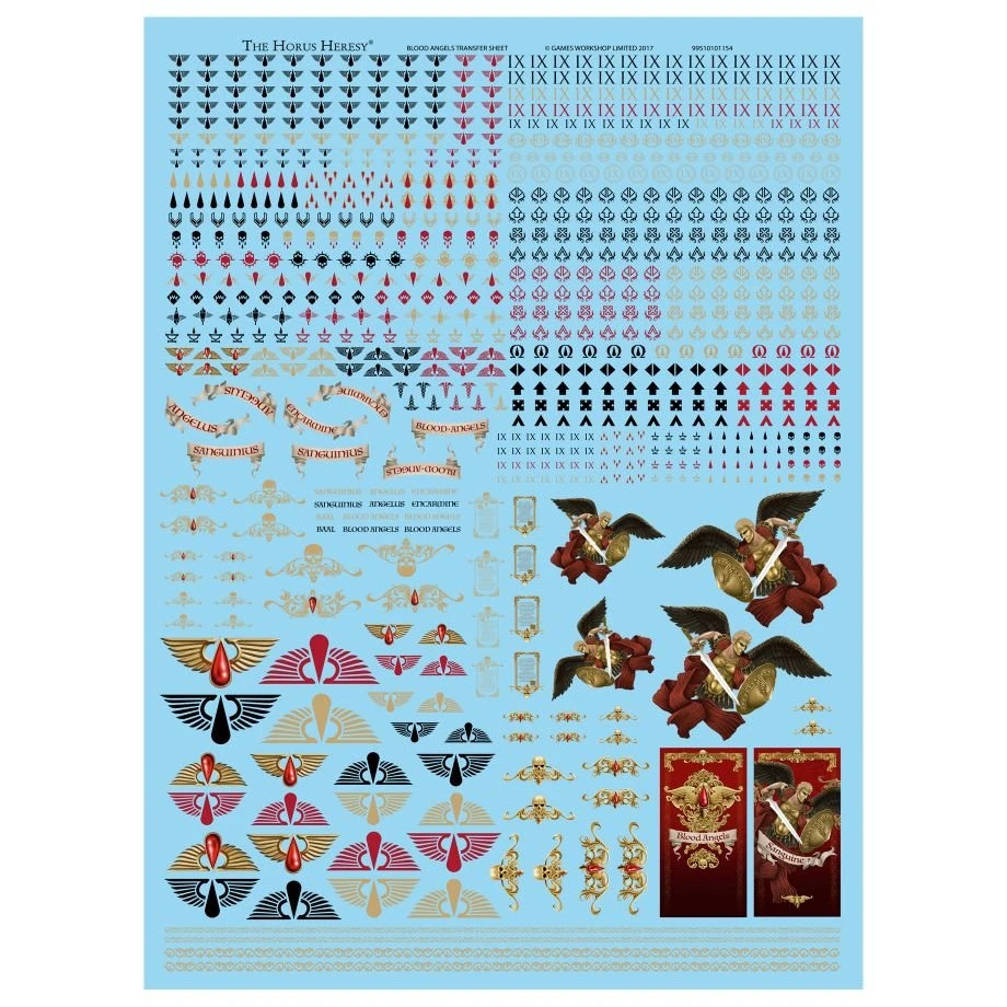 This A4-sized sheet contains 788 high-quality, full-colour waterslide transfers – more than enough for all but the largest Legiones Astartes forces. These transfers allow you to easily customise your miniatures with detailed imagery, specifically designed for the Blood Angels Legion. The sheet features accurate Legion icons and numerals, company markings, and squad designations, as well as a variety of decorative insignias, honours, large vehicle badges, and banner art for your Blood Angels army – including ornate text decals honouring their Primarch Sanguinius, gilded trim laden with artistic flourishes, and lavish painterly artwork of warrior-angels.
