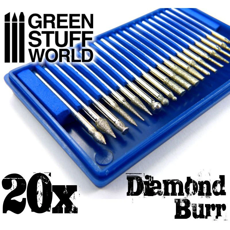 Diamond Burr Set with 20 tips which are compatible with our 2 types of hand drills, as well as automatic milling machines / rotary tools.