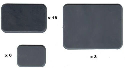 6 Small bases (32mm x 25mm), 18 Medium bases (50mm x 32mm) and 3 Large bases (64mm x 50mm).