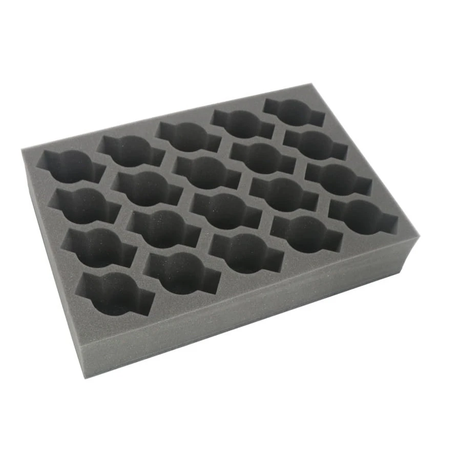 The presented product is a full-size foam tray for storing and carrying 20 cavalry miniatures or models on 40mm bases.