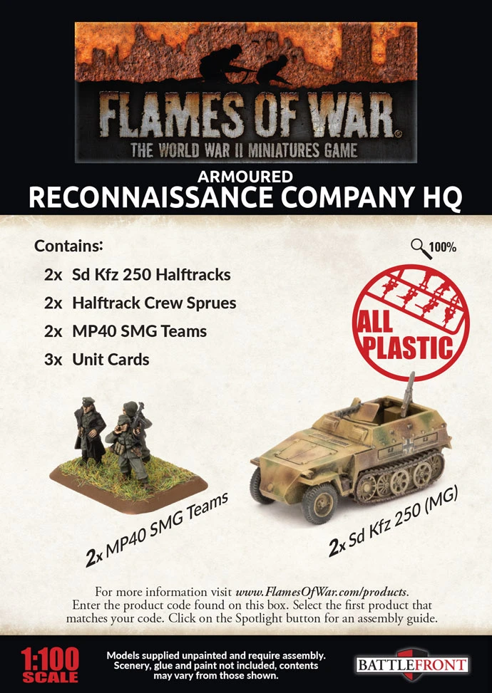 Includes two MP40 SMG Teams, one Sd Kfz 250 Half-track Sprue, one Half-track Crew Sprue, and three Unit Cards.
