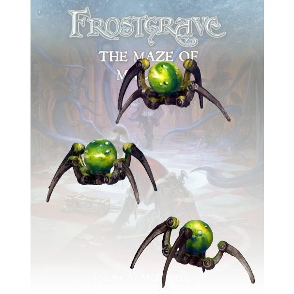Designed by Malcor himself, the glass spiders were a small construct used to refill wine-cups during the fabulous feasts held in the Great Hall. These constructs can actually be found all over Frostgrave as they became a popular gift-shop item among the many who toured the Collegium and museum back at its height. About the size of a house cat, glass spiders consist of a hollow glass orb surrounded by eight wooden and metal legs. Normally these little constructs are harmless.