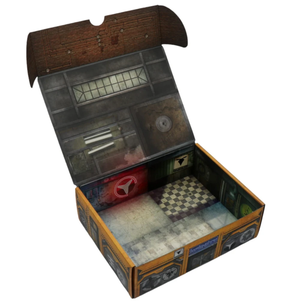 INFINITY is a dynamic, tactical game that makes excellent use of battlefield scenery. We designed our box not only to serve as a safe haven for your miniatures but also to be part of the battlefield action. Its graphic design, styled as an abandoned bar, was conceived of that the box could also be used as a piece of battlefield scenery. Moreover, the game itself can also move into the box’s interior through printed doors, hatches and ladders. To make the game even more exciting, the box comes with a cardboard insert forming the interior walls and an additional element in the form of a container that can be placed on its roof.
