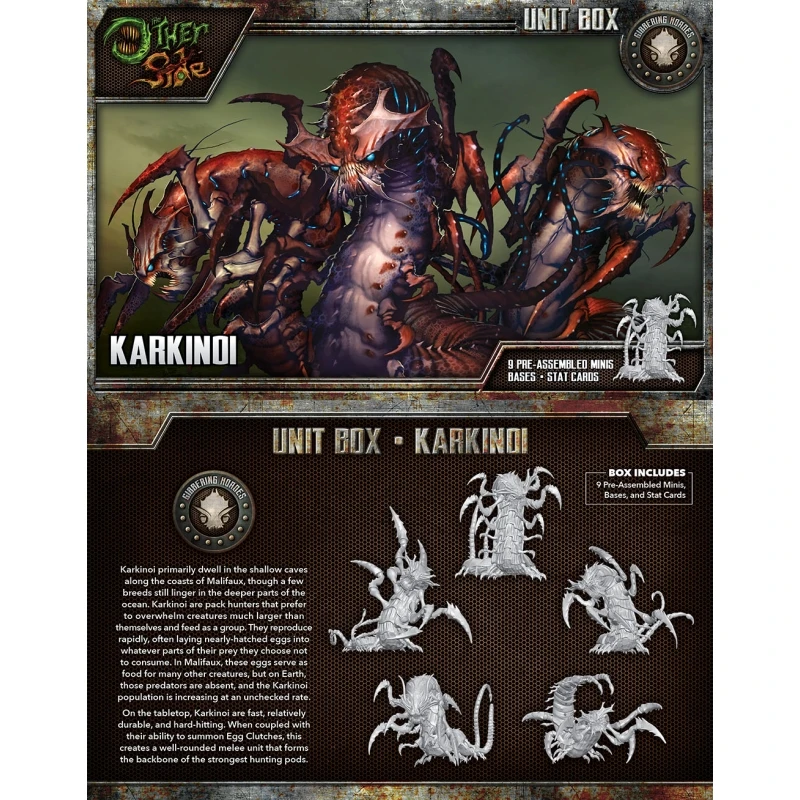 The Other Side is a game about allegiances doing battle across the Earth in a fight for supremacy and survival. Using 32mm miniatures, players will control squads of troops, powerful commanders and massive Titans as they attempt to defeat their foes and seize control of the Earth. Conflict is resolved through the use of a deck of cards, allowing players more control over their own destinies. The Other Side shares a world with Malifaux, but the games are not compatible.