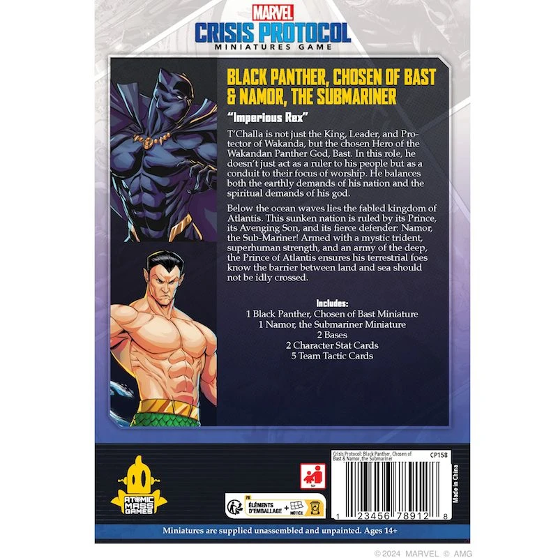 Offering players a new version of T’Challa, Black Panther, Chosen of Bast acts as a spiritual conduit for the people of Wakanda, providing him with powerful gifts for both the mind and body. In his Marvel: Crisis Protocol debut, Namor, the Sub-Mariner king of the sunken kingdom of Atlantis wields his mystic trident and super-human strength as a bulwark between land and sea. These two miniatures are accompanied by 2 character stat cards and five team tactic cards.