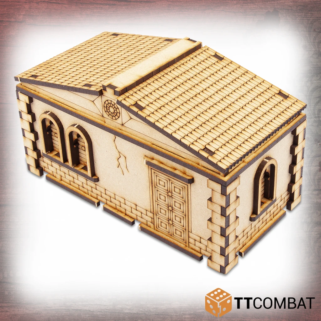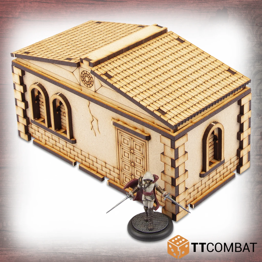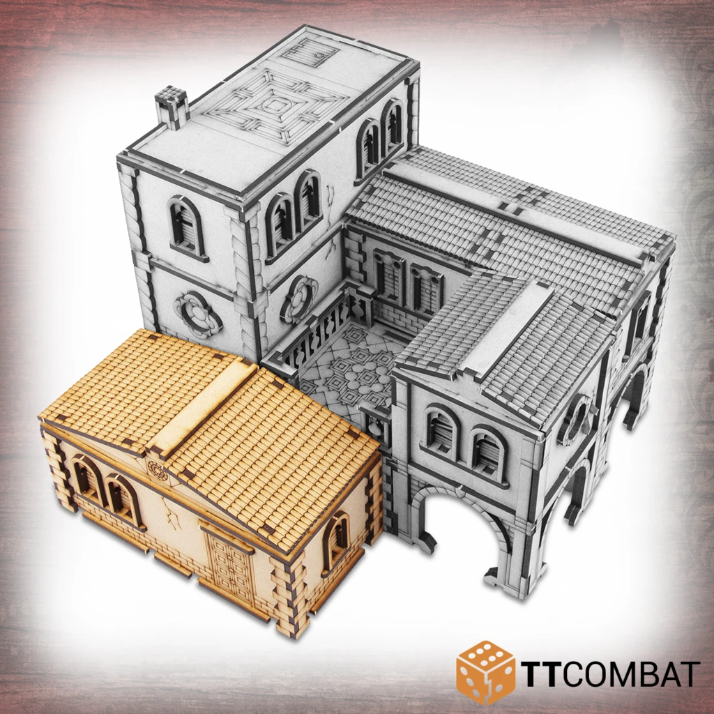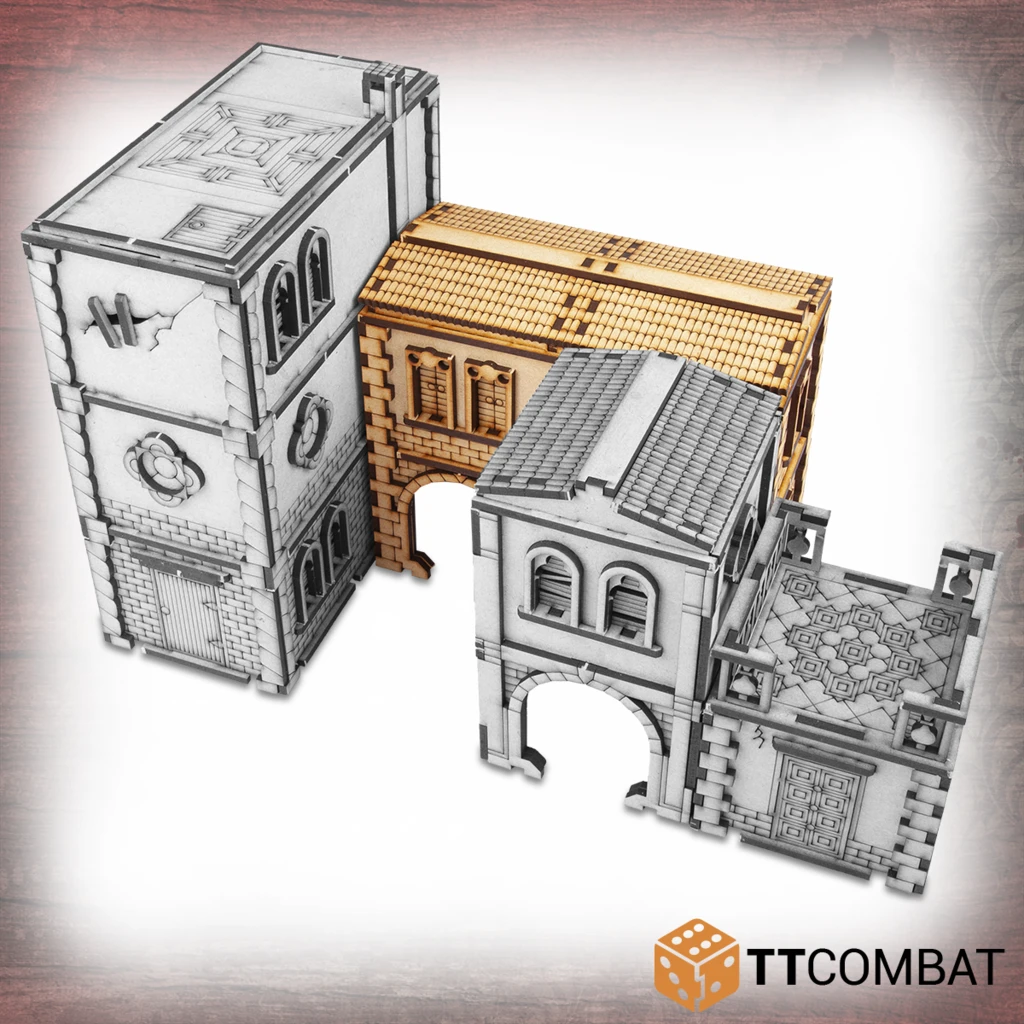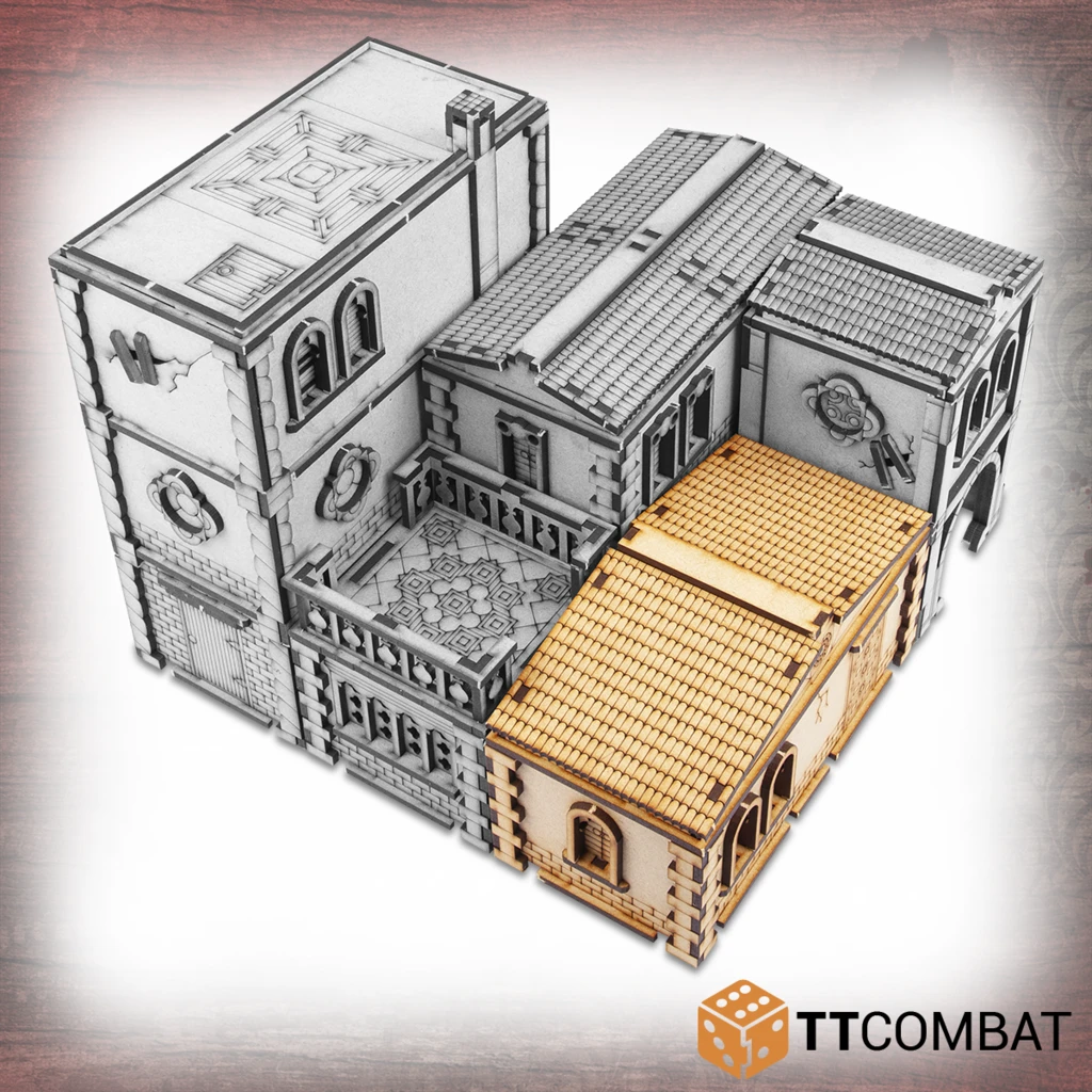 This kit is made from 3mm MDF and has been designed for Carnevale, using multiple storeys to climb and jump, and roofs at easy angles so that miniatures will not fall off when darting across the Venetian skyline. It is a great piece of scenery to use with other 28-32mm games.
