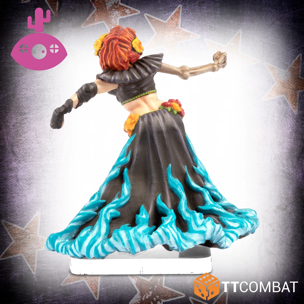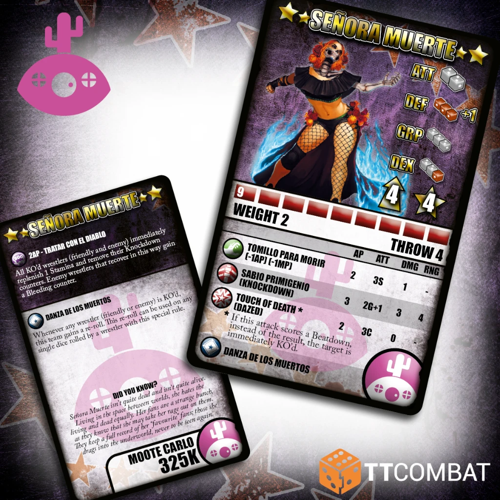 For someone literally called “Lady Death” it should come as no surprise that Senora is a HEEL. Her Crowd Pleaser allows her to make a deal with the devil, and bring everyone back to life! It automatically causes everyone to recover from KO, including enemy wrestlers. Enemies gain a Bleeding counter though, so when they start their activation they might just fall right back over again! Combined with the Danza de los Muertos, you can use Senora Muerte to great effect to gain a bunch of re-rolls and then recover without even having to roll.