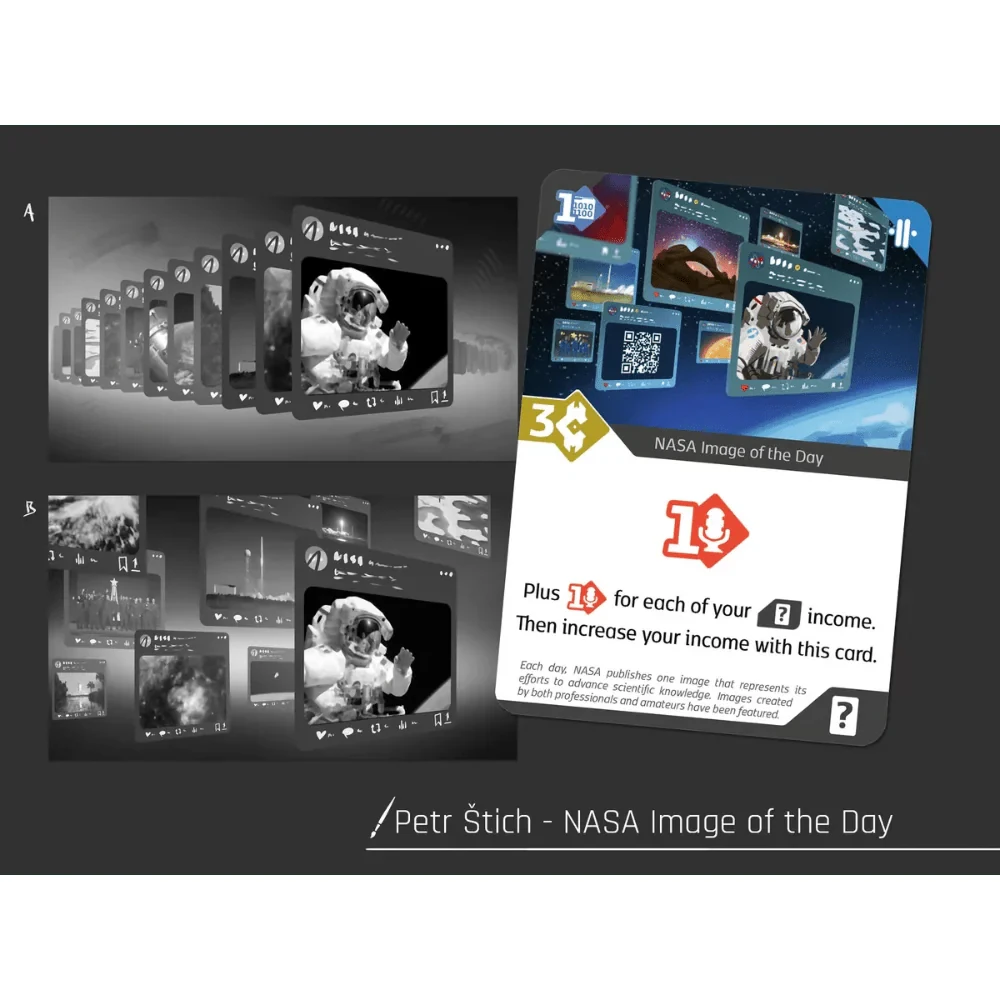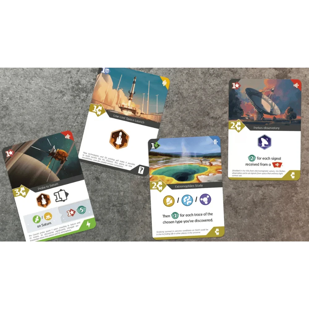 You will also make use of over 200 cards to aid your efforts or focus your research in a particular direction for additional bonuses and rewards. Each card has unique effects and illustrations and depicts real-life technologies, projects, and discoveries (like the ISS, Large Hadron Collider, Perseverance rover, Voyager probe, and many more).