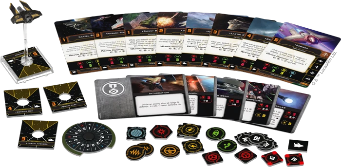 This expansion contains everything you need to supplement your Scum and Villainy squadrons with one of these inexpensive and highly customizable fighters. In addition to an M3-A Interceptor ship miniature featuring a striking black and gold Black Sun paint scheme, new players will also find eight reprinted ship cards—including six limited pilots—as well as reprints of five valuable upgrades and four Quick Build cards that help you jump into battle right away.