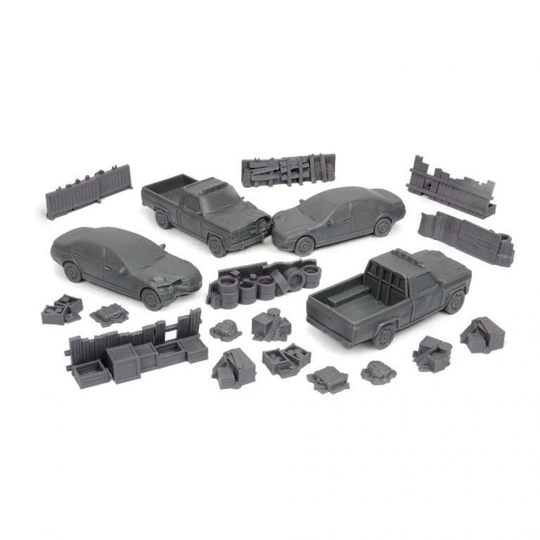 This set contains 12 detailed urban scenery pieces that can be arranged to provide plenty of cover for use in any tabletop game, such as post-apocalyptic, super hero or World War II.