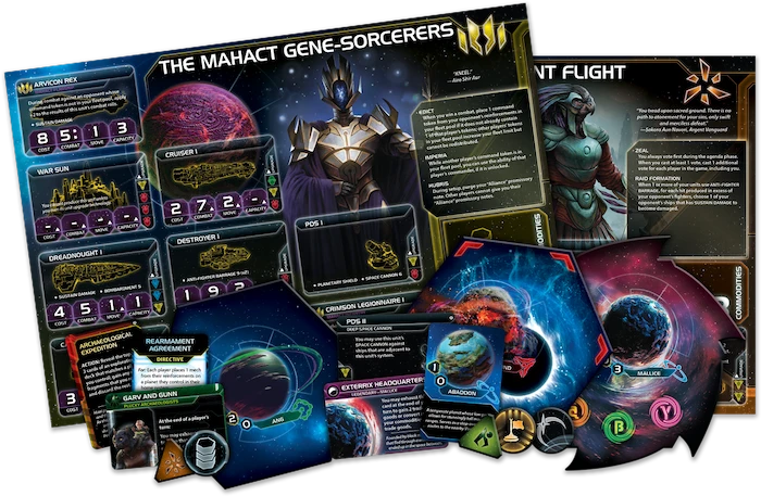 The massive Prophecy of Kings expansion is packed to bursting with new content that you can add to your games of Twilight Imperium. The galaxy has grown far larger, as seven never-before-seen factions enter the game, each boasting their own unique strengths and weaknesses, from the gene-altering powers of the Mahact, to the watchful guard of the Argent Flight, to the mysterious and ancient Empyrean. And new factions aren’t the only way the galaxy grows bigger! Forty new system and hyperlane tiles add new planets and obstacles to the map, and with two new colors of player components included in the box, you can play Twilight Imperium with up to eight players.