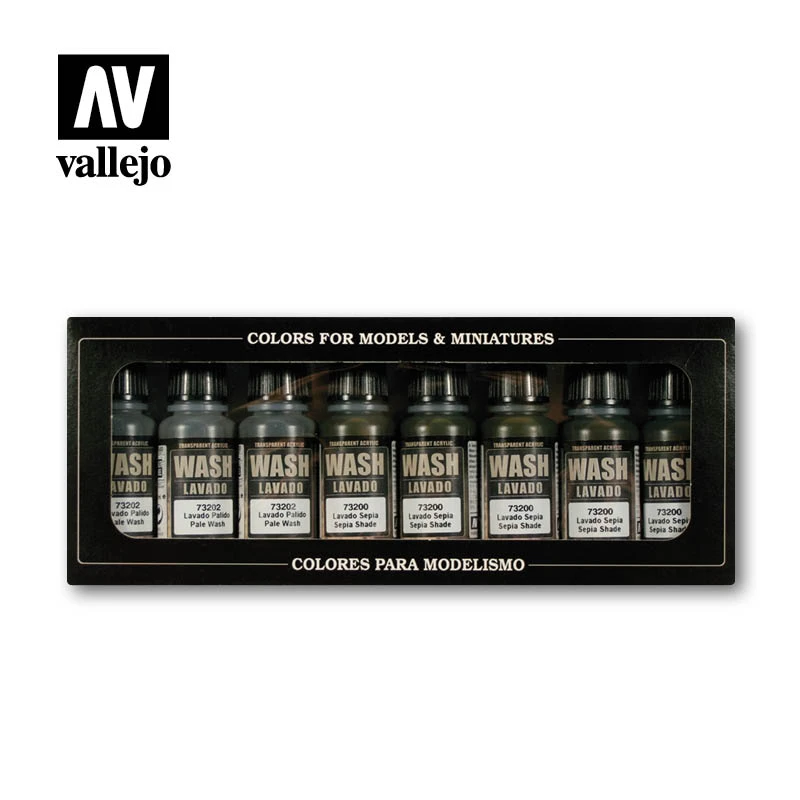 Set with 8 Game Color Wash for painting models and miniatures. Each one of these sets has a specific selection of colors for painting vehicles, figures, etc. Contains 8 bottles of 17 ml./0.57 fl.oz. and color chart.