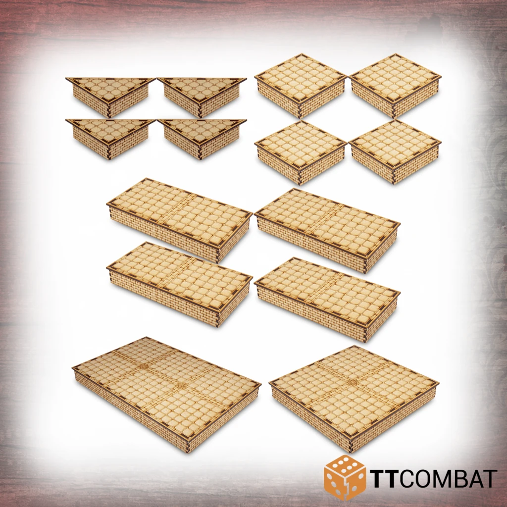 This kit contains enough street sections to make a 2’x2′ board (with space for canals). We based the street sections on the cardboard tiles found in the Carnevale 2-Player Box, which makes this a great upgrade to those tiles.