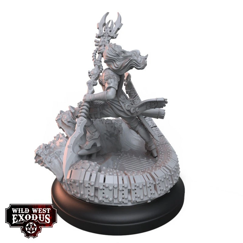 The captain of the Nautilus is highly skilled with the blade and trident and is a formidable adversary on land or at sea, especially as her rotary harpette is never far from her side. Nimue’s love of fame and fortune is only tempered by her sense of loyalty to her crew. Beautiful, yet deadly, Nimue is a fickle force for change in the Wild West but whether for good or ill remains to be seen.