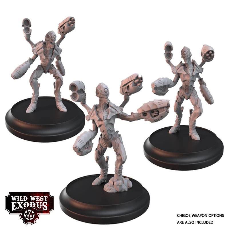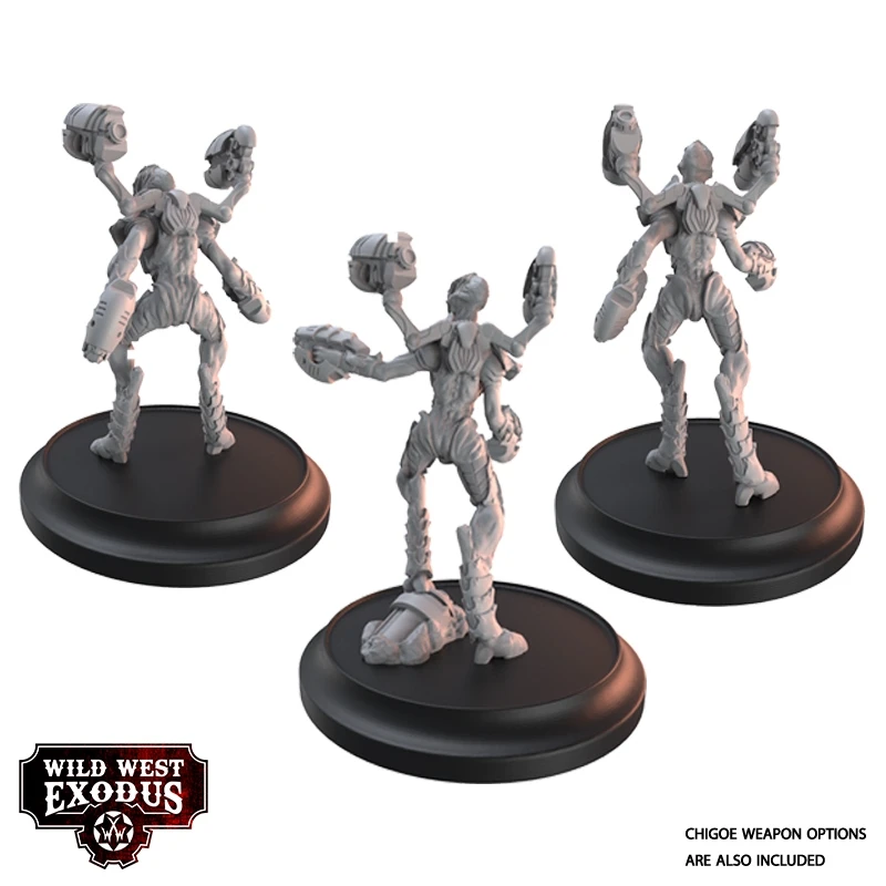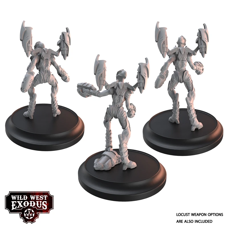 The Viridian Locusts / Chigoe kit builds three multi-part plastic miniatures and includes enough options to enable any of the three miniatures to be built as either a Viridian Chigoe or a Viridian Locust.